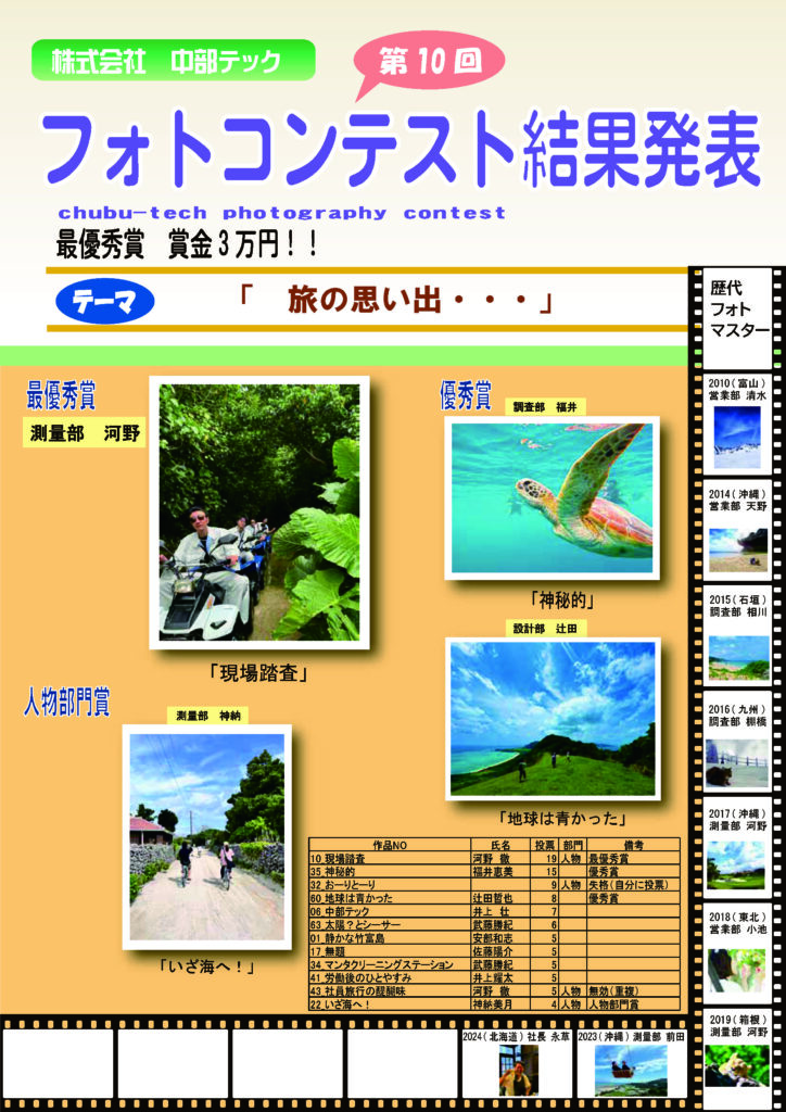 当社が社員旅行時に行っている、フォトコンテストの結果発表を行いました。社員旅行旅行は参加率が約90%と高いので毎年行っています。今年は石垣島を堪能してきました。